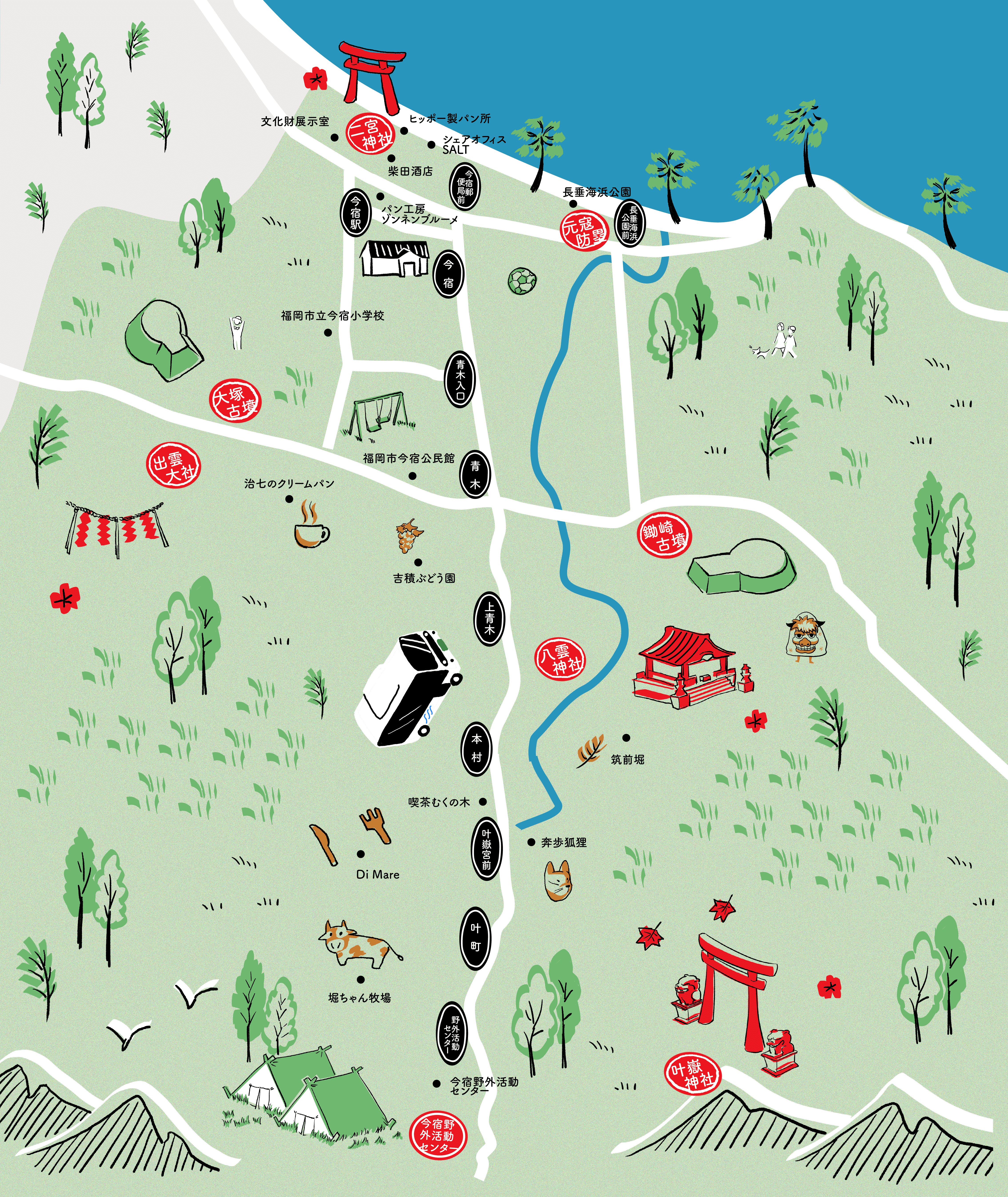 観光マップ ホーム>観光マップ Town Map 観光マップ 今宿で保存されている貴重な歴史資源や、今宿内外の人から愛される本格的な飲食店、全部このマップにまとめています。今宿で、歴史探索や食めぐりを楽しんでみませんか。 ダウンロード 人気のスポット 二宮神社 主祀神は埴安(はにやす)神で、稲の生産豊穣と疫病厄除、福徳開運の神社。長垂海岸に面し、境内には大きな藤棚があります。 長垂元寇防塁 元寇防塁は、鎌倉時代に、蒙古の再襲来に備え博多湾の海岸線20kmに渡って築かれ、長垂は豊前の国が担当したと言われています。長垂海浜公園内にも、元寇防塁跡がありますが、砂の堆積により、埋もれてしまっています。 大塚古墳 6世紀前半に築かれた、全長64mの前方後円墳です。現在でもその形がはっきり見ることができる、貴重な歴史資源です。 出雲大社福岡分院 縁結びで知られる神社。元々は中央区大手門に位置していましたが、昭和20年空襲により焼失。現在の西区今宿へ移設されました。 鋤崎古墳 4世紀から5世紀初頭にかけて築造された、前方後円墳です。今宿の首長墳に位置づけられ、羨道(せんどう)を備えた横穴式石室を持っています。未盗掘のまま発見された石室や出土品のレプリカが福岡市博物館に展示されています。 八雲神社 青木・上ノ原の産土(うぶすな)神として祀られています。五穀豊穣を祈願して行われる「今宿青木獅子舞(福岡市無形民俗文化財)」は、元旦に境内で奉納されます。 叶岳神社 600年ほど前に上原の豪族吉住因幡守忠親によって建立され、「願いが叶う」として地元で親しまれている神社です。正月には大祭で多くの住民で賑わうほか、ハイキングコースとしても人気を集めています。 今宿野外活動センター 叶岳、高祖山などに囲まれた緑豊かな 施設です。 都心部からのアクセスの良さに 加え、広大な敷地内では、日帰りの野外 調理やBBQ、宿泊キャンプ、 川遊び、レクリエーション等さま ざまな野外活動を楽しむことができます。 関連のマップ >> 西区の宝散策マップ1(今宿・周船寺) >> 西区の宝散策マップ2(今宿・周船寺) >> 西区登山マップ(叶岳、高祖山) >> 今宿姪浜線に乗って野外活動センターへ >> 麺街道の旅 共有: クリックして X で共有 (新しいウィンドウで開きます) X Facebook で共有するにはクリックしてください (新しいウィンドウで開きます) Facebook いいね 読み込み中…