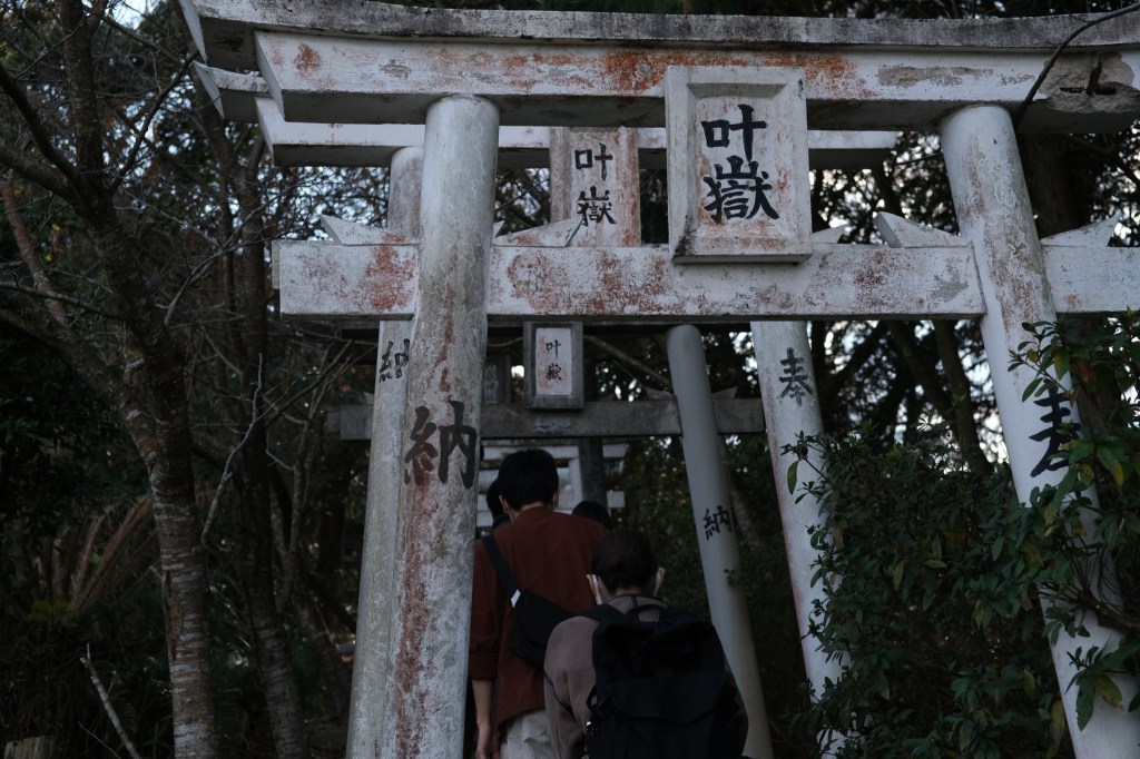 叶嶽神社(かのうだけじんじゃ)の遥拝所は、叶嶽登山口から10分ほど登ったところにあります。さらに1時間ほど登ると、叶嶽山頂(341m)。長垂海岸を一望することができます。