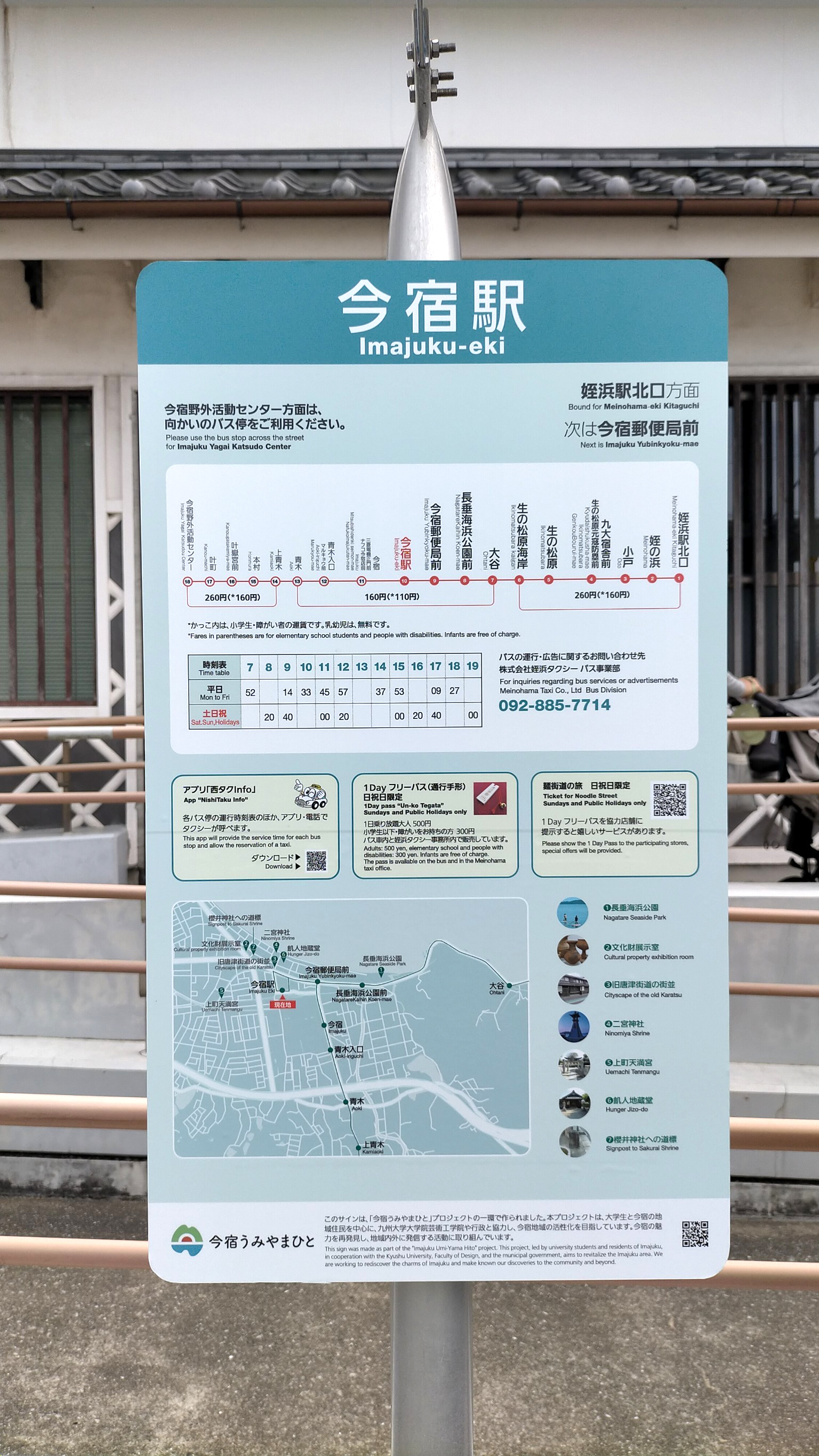 今宿姪浜線「なぎさ号」は、株式会社姪浜タクシーが運営する、姪浜〜今宿を走る乗合バスです。九州大学の学生を中心とした「今宿うみやまひと」プロジェクトのメンバーが、バス運営関係者らと共に、現状のバス停サインの課題に関するユーザーアンケートを実施。得られた調査を基に、高齢者や海外の観光客など様々な利用者にも見やすく、かつ分かりやすい情報を提供するバス停サインのリデザインを行いました。