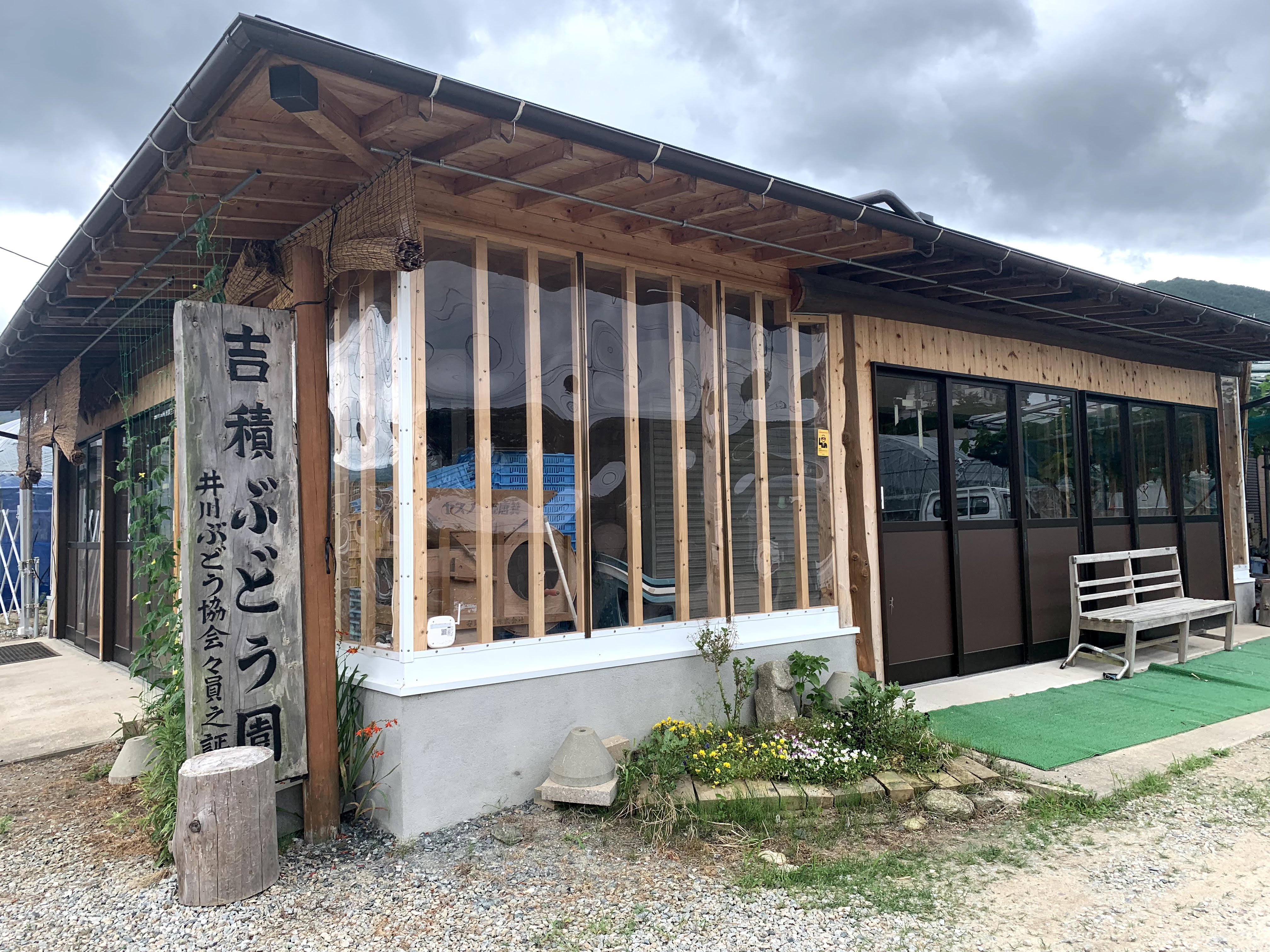 上ノ原地区には、かつて40軒ほどのぶどう園がありましたが、今は3軒にまで減ってしまいました。ぶどうを市場に出すと価格が安定せず、後継者不足も起こってしまっているためです。そこで、吉積ぶどう園では、直売方式を導入し、6年ほど前から直売所を建てて販売しています。