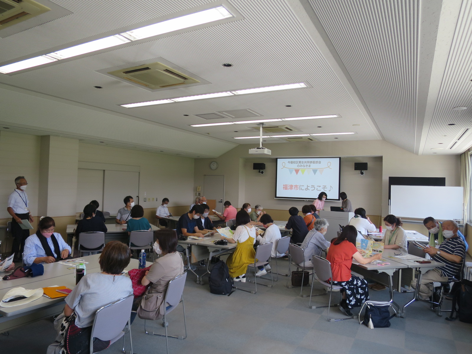 福津市ふくとぴあで、福津市の男女共同参画室地域推進委員、ふくつ男女共同参画協議会「綸りん(りんりん)」、市民ボランティア団体「ふくつながり」のそれぞれの成り立ちや活動が紹介されました。
