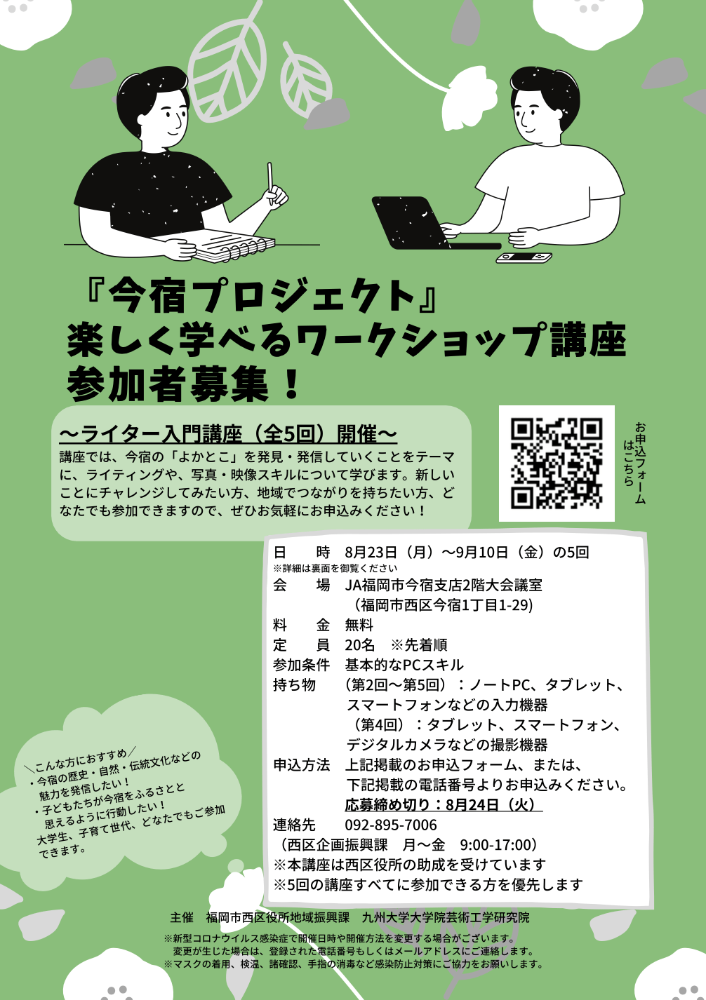 講座では、福岡市西区今宿地区の「よかとこ」を発見・発信していくことをテーマに、ライティングや、写真・映像スキルについて学びます。新しいことにチャレンジしてみたい方、地域でつながりを持ちたい方、どなたでも参加できますので、お申し込みをお待ちしております。