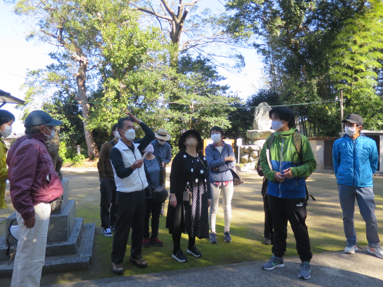 立ち寄った八雲神社で獅子舞に関わる地元の人の話を聞きました。八雲神社と金印のつながりについて参加者にとっては初耳で、歴史のもうひとつの説に引き込まれました。