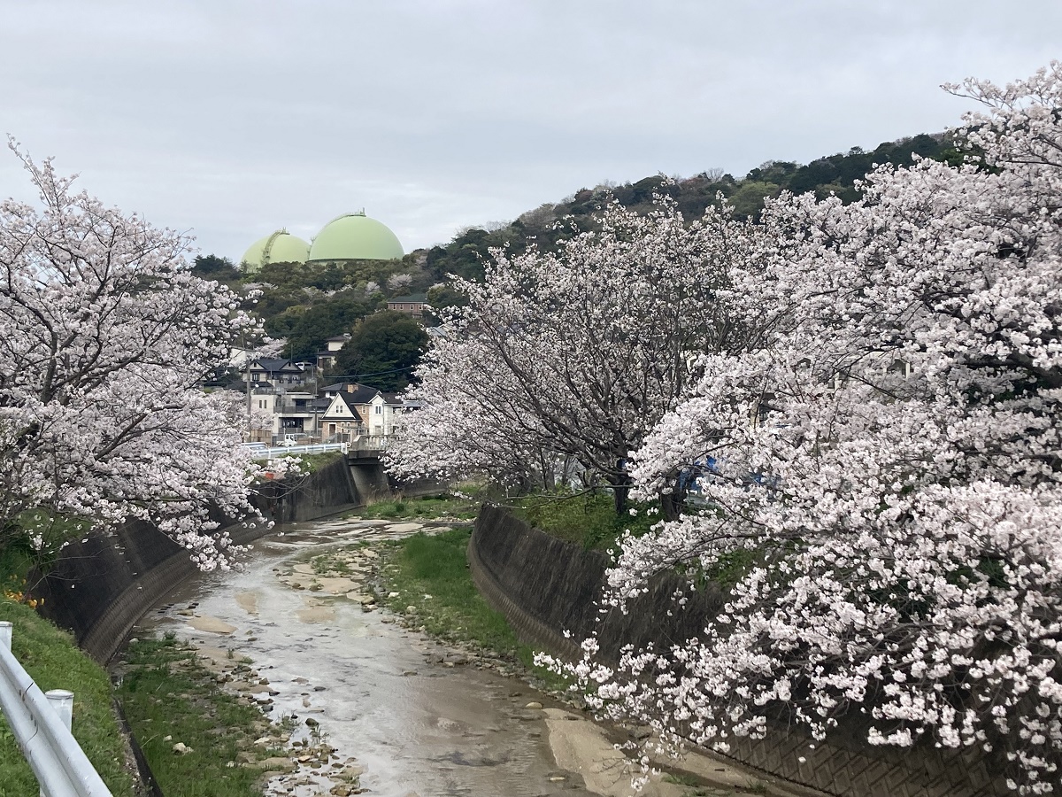 今宿野外活動センターから長垂海岸に流れている七寺川には、短い距離ですが桜並木が点在しています。こちらも、地域の有志の皆さんで植樹したものが、数十年たってここまで立派になったのだそうです。周辺に駐車場はありませんので、長時間車を停めることはご遠慮くださいね。